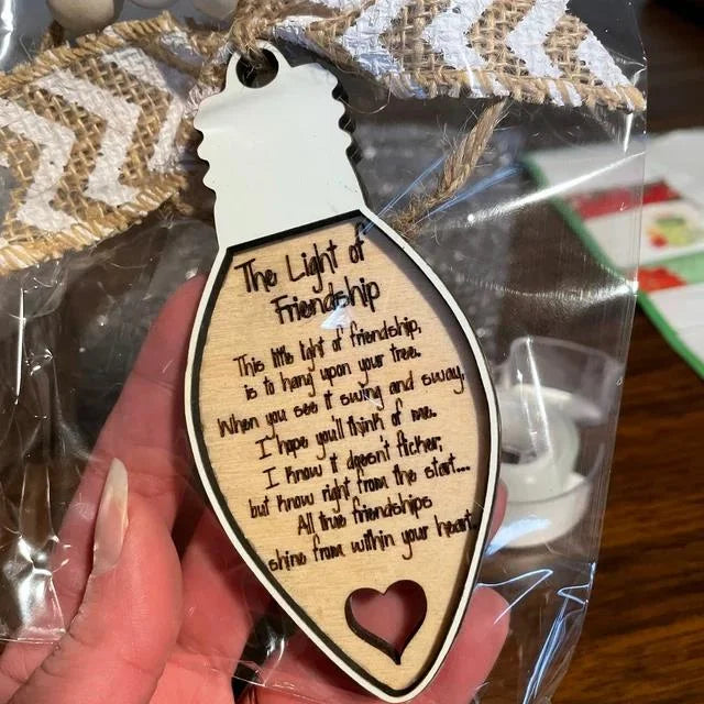 šThis little light of friendship, is to hang upon your tree. When you see it swing and sway I hope you'll think of me. I know you'll think of me. I know it doesn't flicker, but know right from the start....All true friendships shine from within your heart.āØ