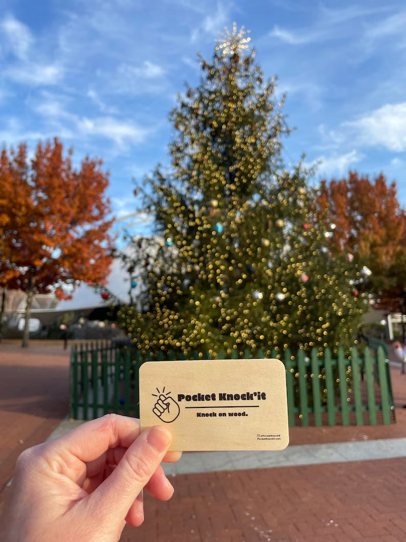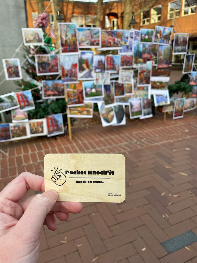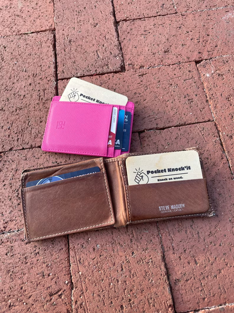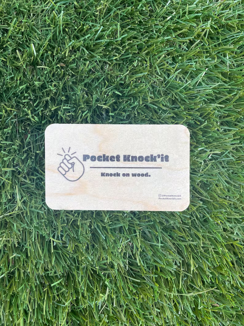 ✨Pocket Knock'it is a small credit card sized piece of wood that sits in your wallet so that you always have wood to knock on for good luck when you need it.